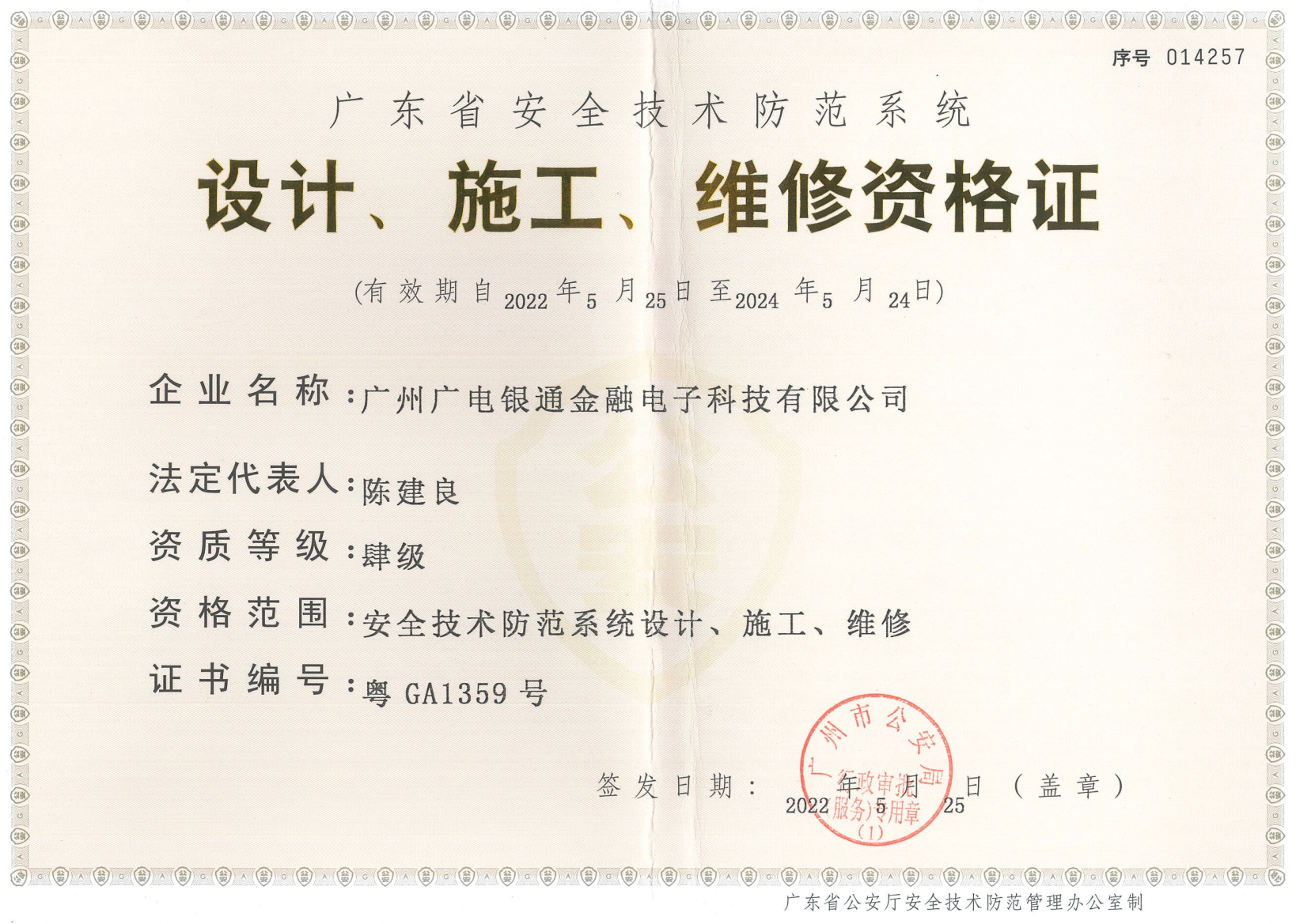 廣東省安全技術(shù)防范系統(tǒng)設(shè)計(jì)、施工、維修資格證(四級(jí))